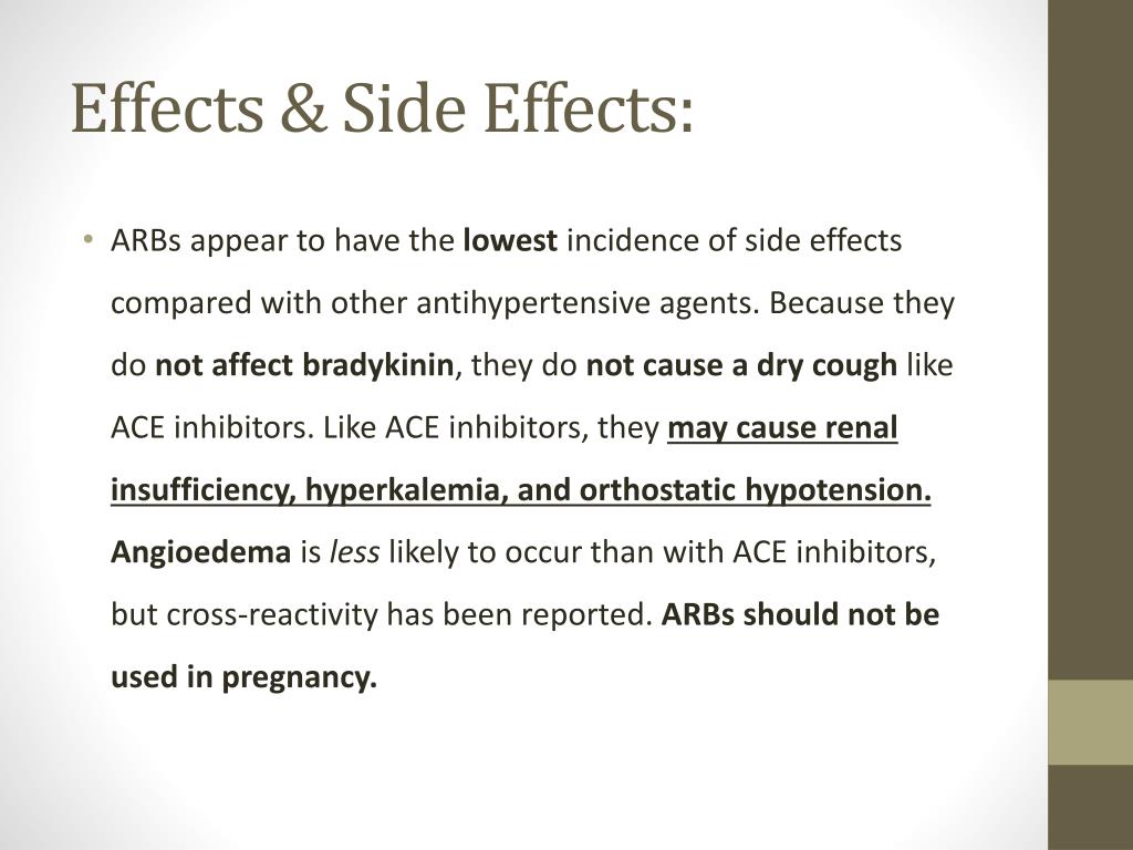 Effects & Side Effects: • ARBs appear to have the lowest incidence of side effects compared with other antihypertensive agents. Because they do not affect bradykinin, they do not cause a dry cough like ACE inhibitors. Like ACE inhibitors, they may cause renal insufficiency, hyperkalemia, and orthostatic hypotension. Angioedema is less likely to occur than with ACE inhibitors, but cross-reactivity has been reported. ARBs should not be used in pregnancy.