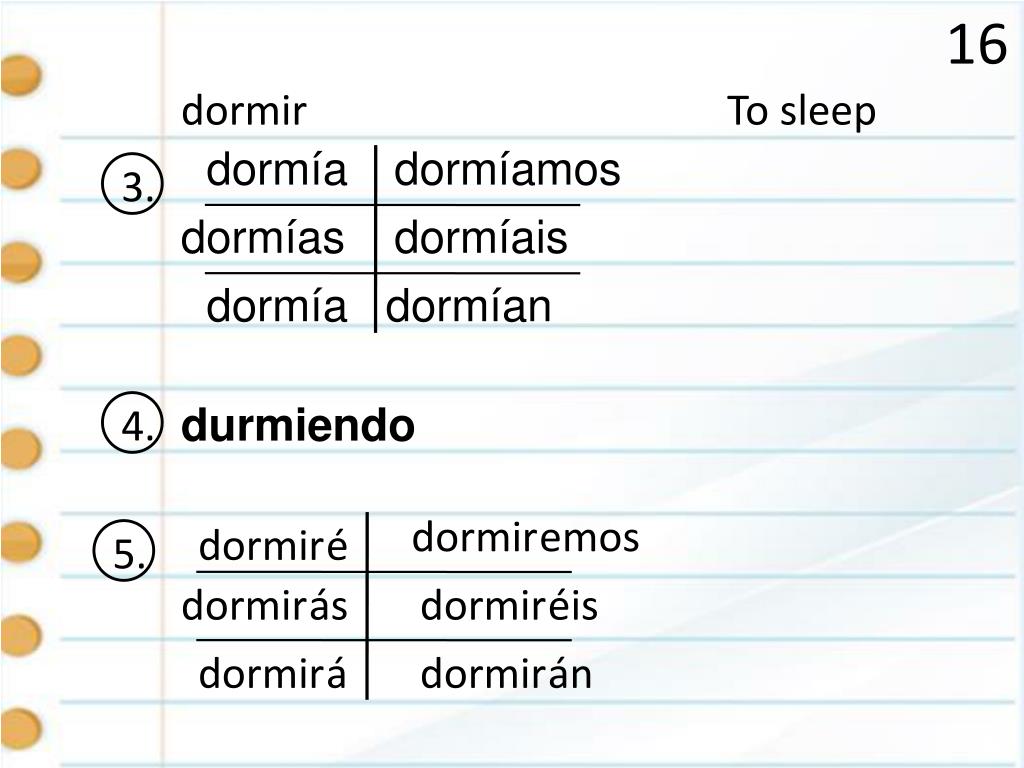 16 dormir To sleep dormía dormíamos dormías dormíais dormía dormían 3. 4. durmiendo 5. dormir emos dormir é dormir dormir ás éis dormir dormir á án