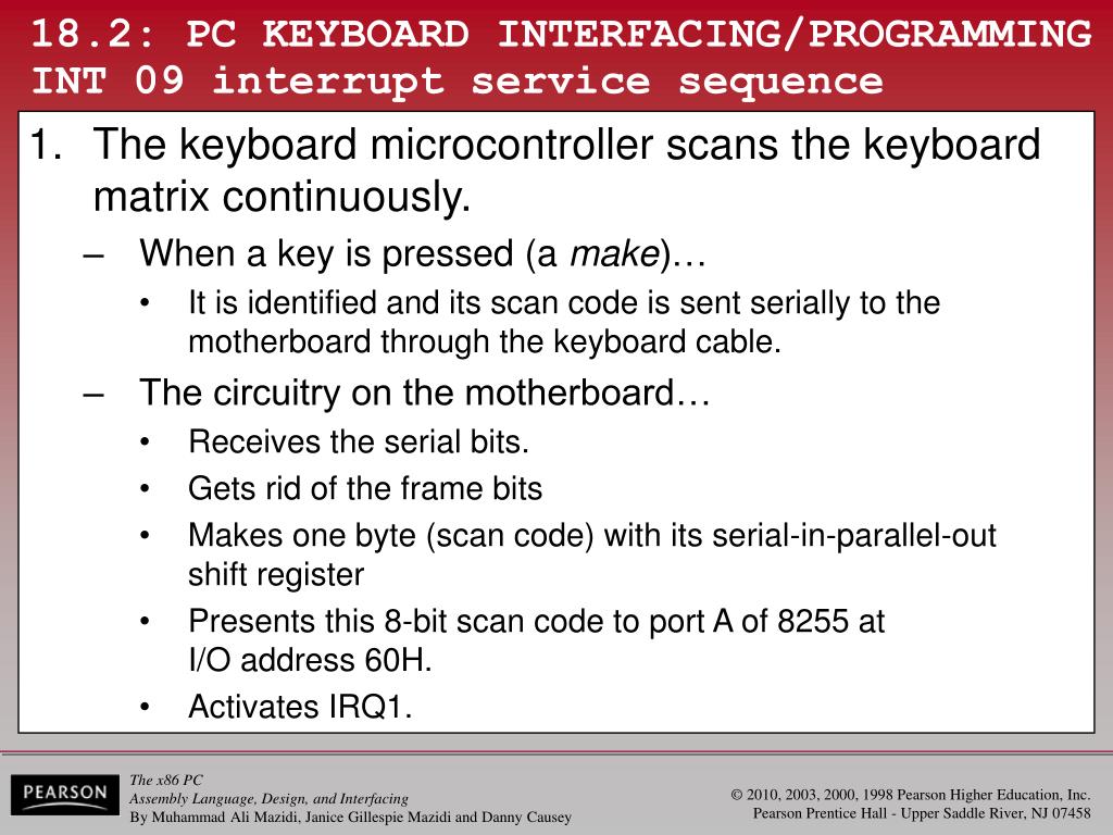 18.2: PC KEYBOARD INTERFACING/PROGRAMMING INT 09 interrupt service sequence • The keyboard microcontroller scans the keyboard matrix continuously. • When a key is pressed (a make)… • It is identified and its scan code is sent serially to the motherboard through the keyboard cable. • The circuitry on the motherboard… • Receives the serial bits. • Gets rid of the frame bits • Makes one byte (scan code) with its serial-in-parallel-outshift register • Presents this 8-bit scan code to port A of 8255 atI/O address 60H. • Activates IRQ1.