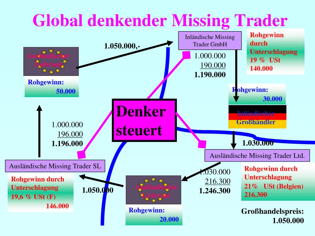 Global denkender Missing Trader Rohgewinn durch Unterschlagung 19 % USt 140.000 Inländische Missing Trader GmbH 1.050.000,- 1.000.000 190.000 1.190.000 Ausländischer Lieferant Rohgewinn: 50.000 Rohgewinn: 30.000 Denker steuert Inländischer Großhändler 1.000.000 196.000 1.196.000 1.030.000 Ausländische Missing Trader Ltd. Ausländische Missing Trader SL Rohgewinn durch Unterschlagung 21% USt (Belgien) 216.300 1.030.000 216.300 1.246.300 Rohgewinn durch Unterschlagung 19,6 % USt (F) 146.000 Ausländischer Lieferant 1.050.000 Rohgewinn: 20.000 Großhandelspreis: 1.050.000
