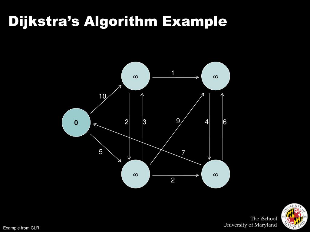 Dijkstra’s Algorithm Example 1 10 0 9 2 3 4 6 5 7 2 Example from CLR