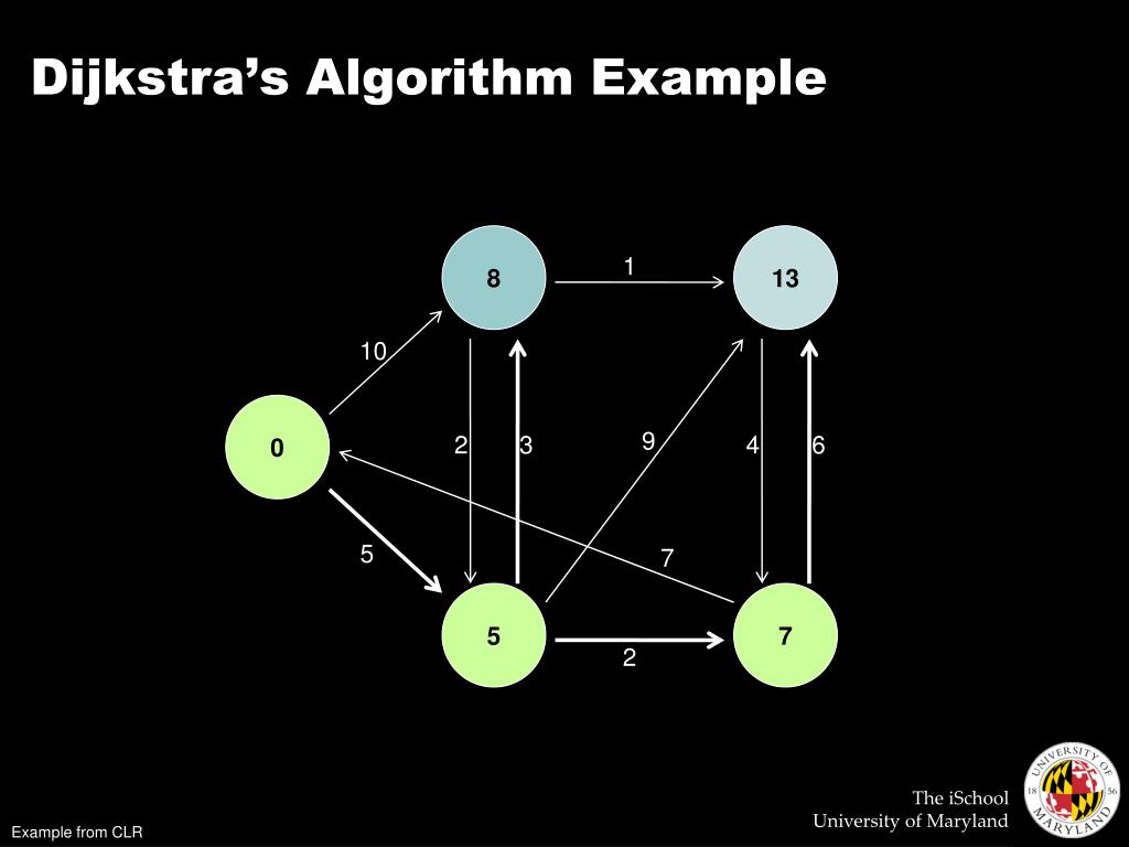 Dijkstra’s Algorithm Example 8 13 1 10 0 9 2 3 4 6 5 7 5 7 2 Example from CLR