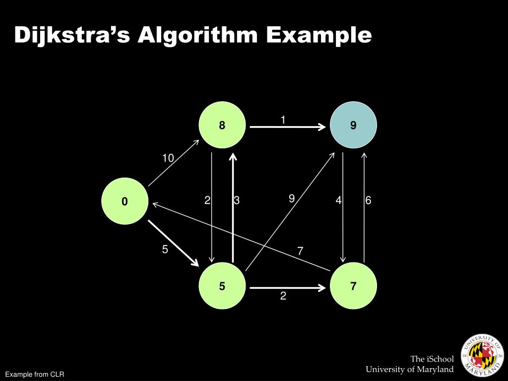 Dijkstra’s Algorithm Example 8 14 1 10 0 9 2 3 4 6 5 7 5 7 2 Example from CLR
