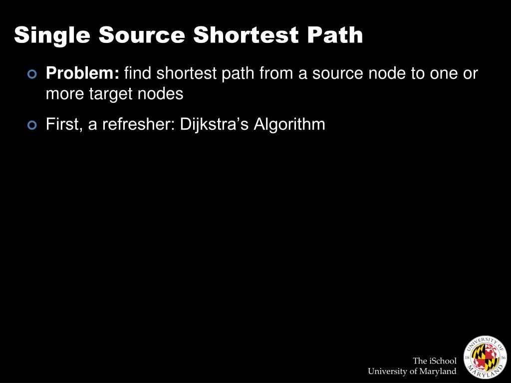 Single Source Shortest Path • Problem: find shortest path from a source node to one or more target nodes • First, a refresher: Dijkstra’s Algorithm