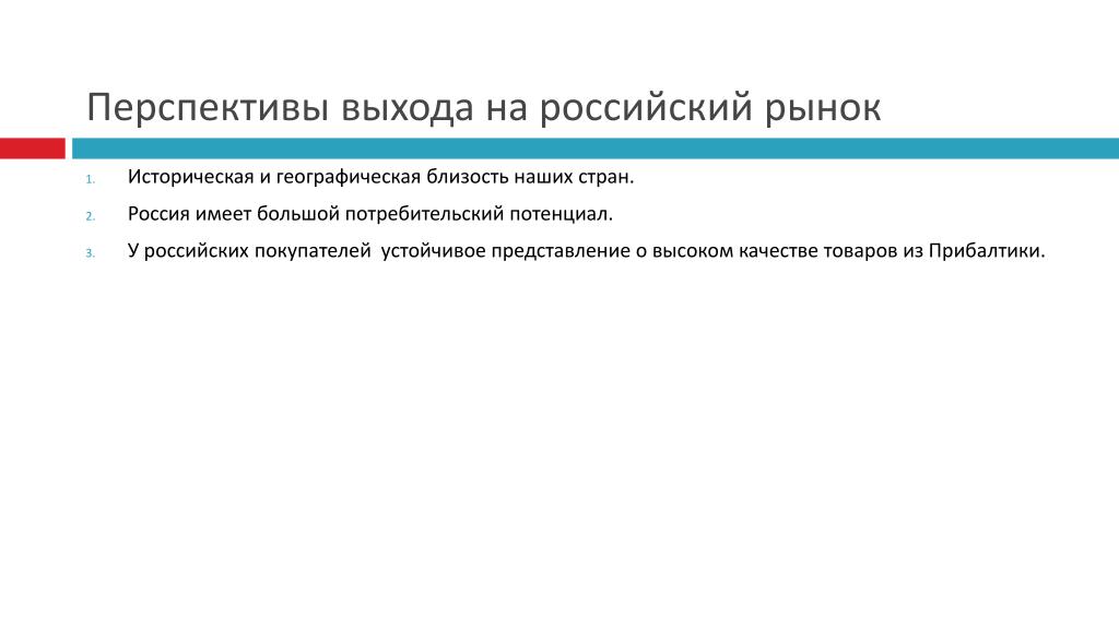 Перспективы выхода на российский рынок • Историческая и географическая близость наших стран. • Россия имеет большой потребительский потенциал. • У российских покупателей устойчивое представление о высоком качестве товаров из Прибалтики.