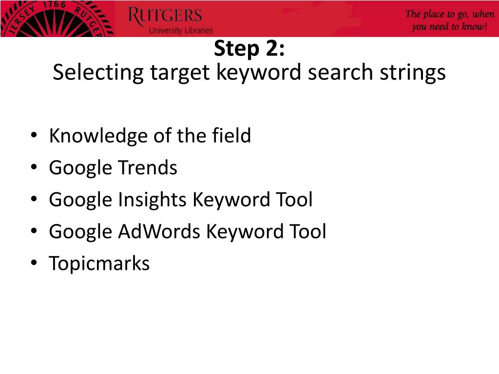 Step 2:Selecting target keyword search strings • Knowledge of the field • Google Trends • Google Insights Keyword Tool • Google AdWords Keyword Tool • Topicmarks