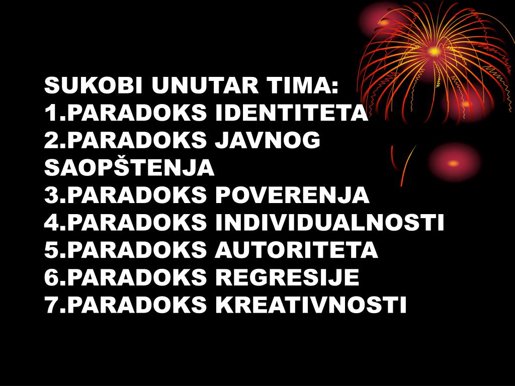 SUKOBI UNUTAR TIMA:1.PARADOKS IDENTITETA2.PARADOKS JAVNOG SAOPŠTENJA3.PARADOKS POVERENJA4.PARADOKS INDIVIDUALNOSTI5.PARADOKS AUTORITETA6.PARADOKS REGRESIJE7.PARADOKS KREATIVNOSTI