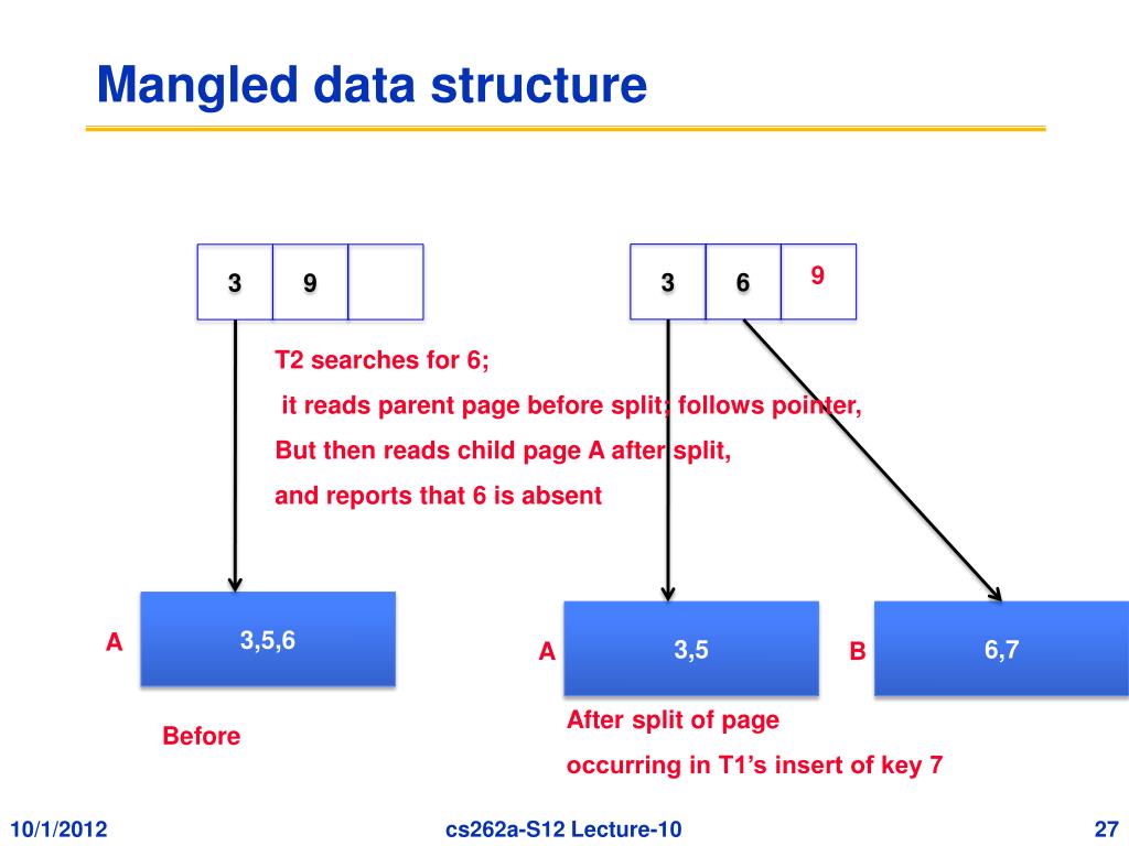 Mangled data structure 3 6 3 9 9 T2 searches for 6; it reads parent page before split; follows pointer, But then reads child page A after split, and reports that 6 is absent 3,5,6 3,5 6,7 A A B After split of page occurring in T1’s insert of key 7 Before