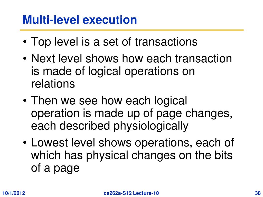 Multi-level execution • Top level is a set of transactions • Next level shows how each transaction is made of logical operations on relations • Then we see how each logical operation is made up of page changes, each described physiologically • Lowest level shows operations, each of which has physical changes on the bits of a page