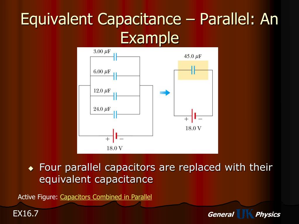 Equivalent Capacitance – Parallel: An Example • Four parallel capacitors are replaced with their equivalent capacitance Active Figure: Capacitors Combined in Parallel EX16.7