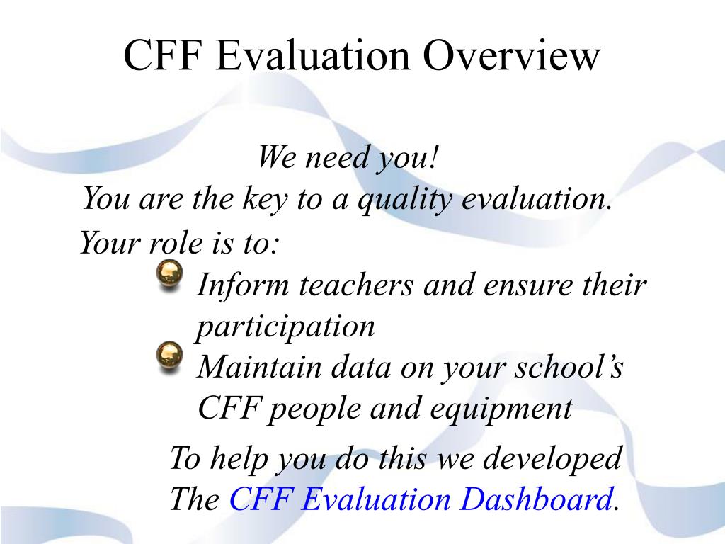 CFF Evaluation Overview We need you! You are the key to a quality evaluation. Your role is to: • Inform teachers and ensure their participation • Maintain data on your school’s CFF people and equipment To help you do this we developedThe CFF Evaluation Dashboard.