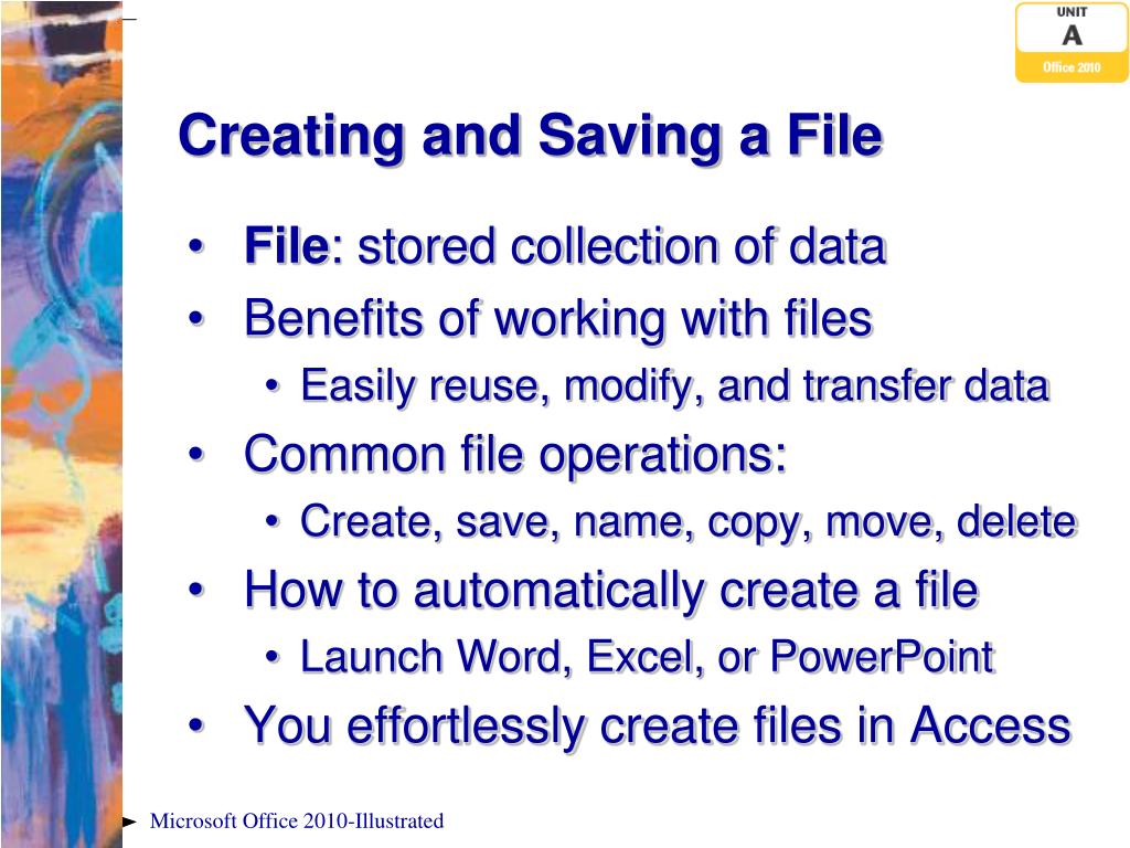 Creating and Saving a File • File: stored collection of data • Benefits of working with files • Easily reuse, modify, and transfer data • Common file operations: • Create, save, name, copy, move, delete • How to automatically create a file • Launch Word, Excel, or PowerPoint • You effortlessly create files in Access Microsoft Office 2010-Illustrated