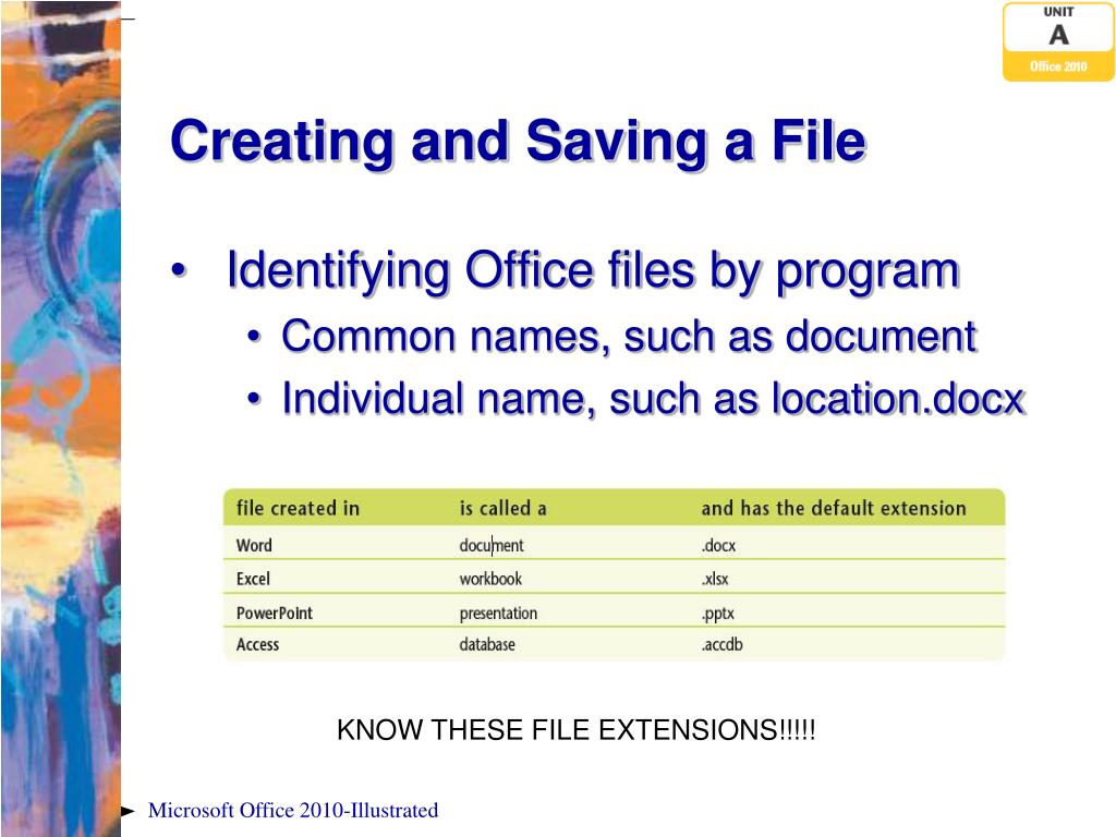 Creating and Saving a File • Identifying Office files by program • Common names, such as document • Individual name, such as location.docx KNOW THESE FILE EXTENSIONS!!!!! Microsoft Office 2010-Illustrated