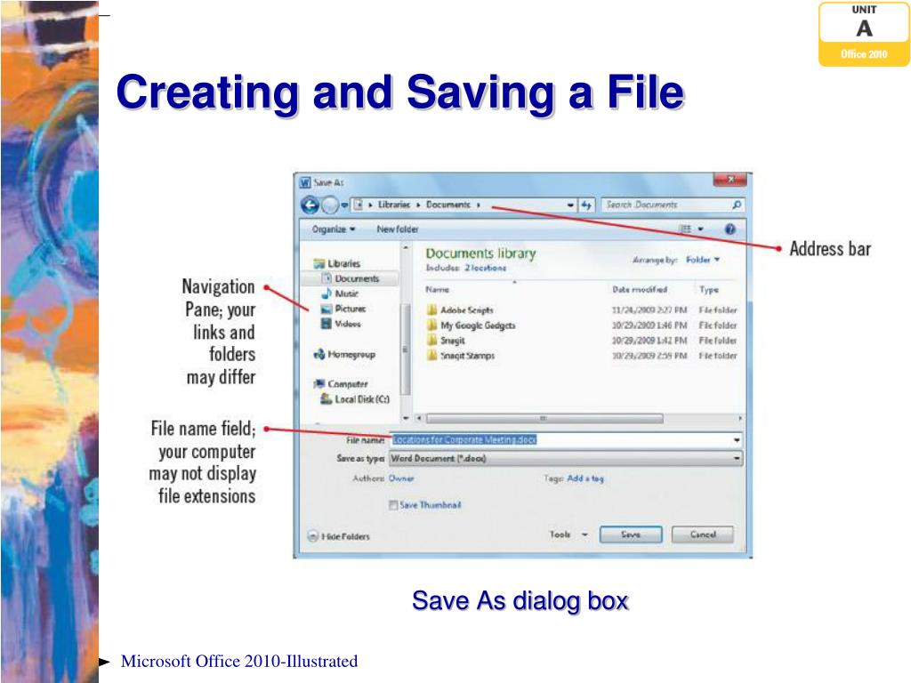 Creating and Saving a File Save As dialog box Microsoft Office 2010-Illustrated