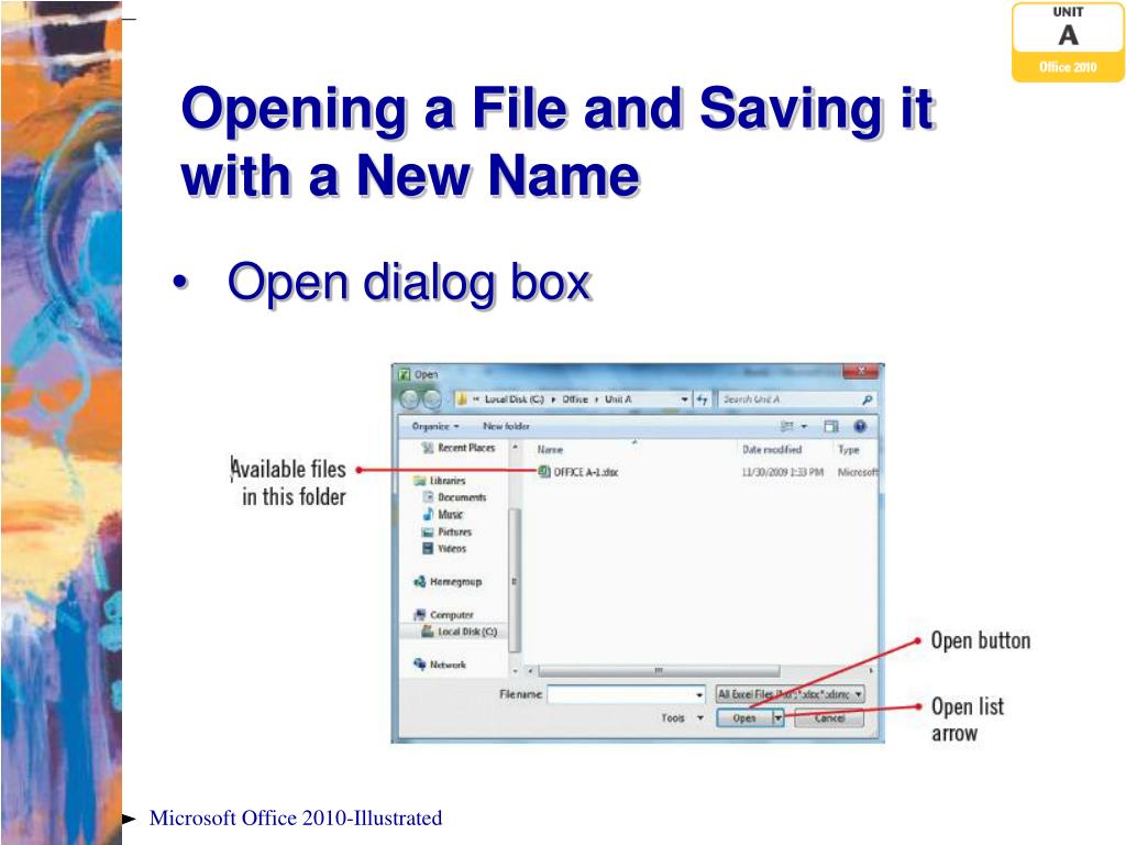 Opening a File and Saving it with a New Name • Open dialog box Microsoft Office 2010-Illustrated