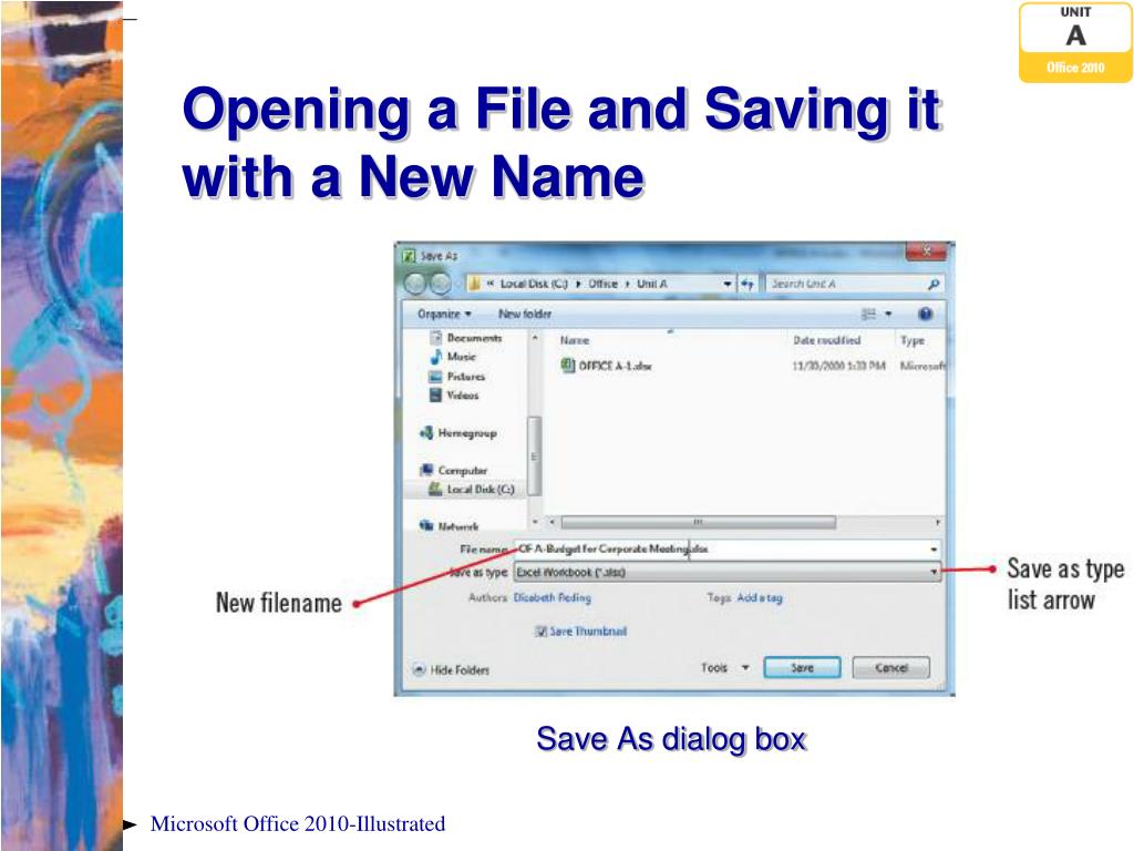Opening a File and Saving it with a New Name • You may need to reuse existing files • Example: using old budget as template for new • Open dialog box: opens files • Save As dialog box • Save existing file with new name • File may be stored in various locations • Original file remains intact Microsoft Office 2010-Illustrated