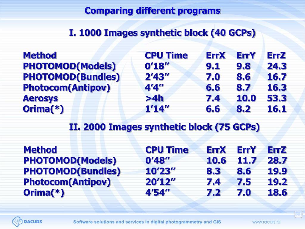 Comparing different programs Two synthetic test blocks 1000 images, 30000 points, 40 GCPs, H=2000m, f=150mm,Scale – 1:13000 Deviations – 10 mkm (image), 20 cm(XYZ) 2000 images, 60000 points, 75 GCPs, H=2000m, f=150mm,Scale – 1:13000 Deviations – 10 mkm (image), 40 cm(XYZ) Computers used PHOTOMOD/Aerosys Celeron 2.8 Ghz Photocom(Antipov) Pentium 4 3 Ghz Orima Core2Duo E6400