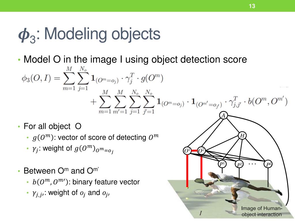 𝝓3: Modeling objects • Model O in the image I using object detection score • For all object O • : vector of score of detecting • : weight of • Between Om and Om’ • : binary feature vector • : weight of and A H O1 P2 P1 PL O2