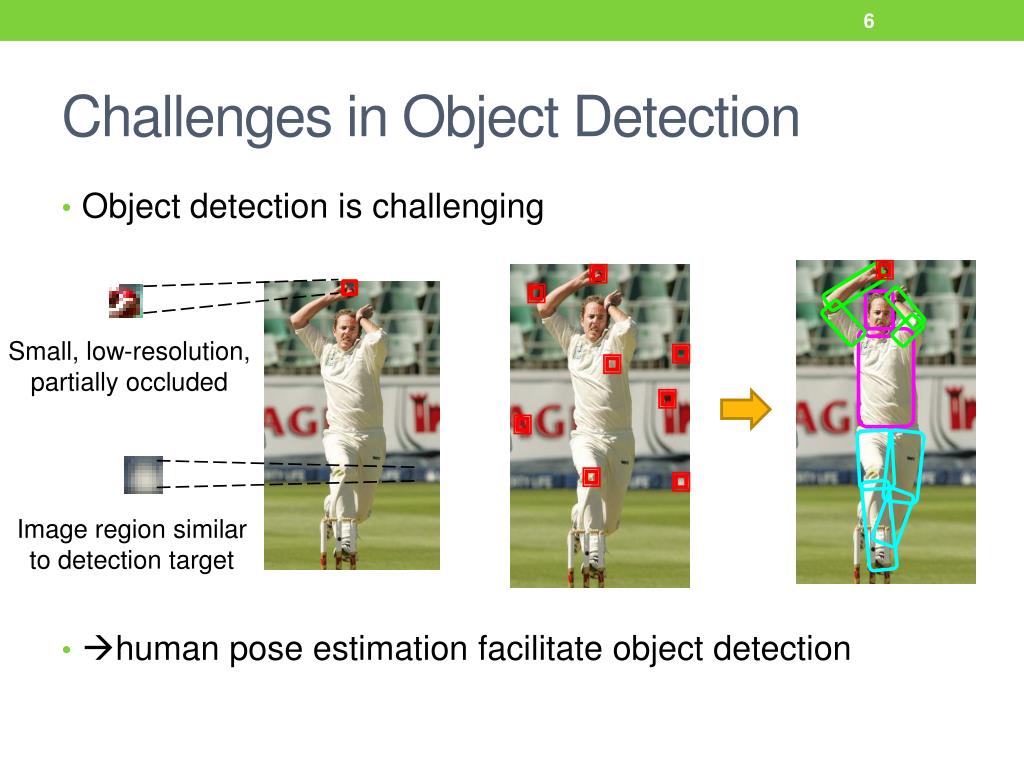 Challenges in Object Detection • Object detection is challenging • human pose estimation facilitate object detection Small, low-resolution, partially occluded Image region similar to detection target
