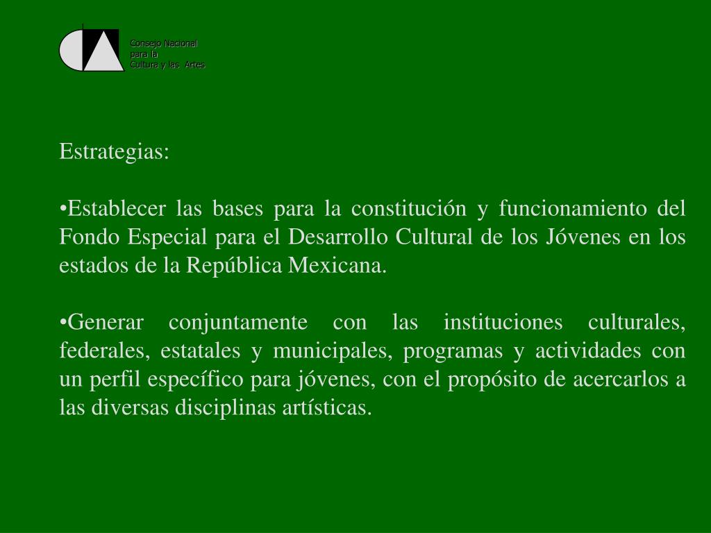 Consejo Nacional para la Cultura y las Artes • Estrategias: • Establecer las bases para la constitución y funcionamiento del Fondo Especial para el Desarrollo Cultural de los Jóvenes en los estados de la República Mexicana. • Generar conjuntamente con las instituciones culturales, federales, estatales y municipales, programas y actividades con un perfil específico para jóvenes, con el propósito de acercarlos a las diversas disciplinas artísticas.