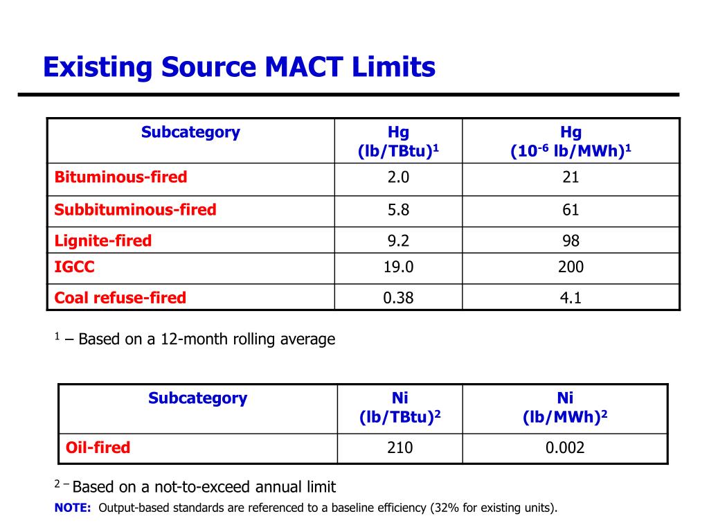 Existing Source MACT Limits 1 – Based on a 12-month rolling average 2 – Based on a not-to-exceed annual limit NOTE: Output-based standards are referenced to a baseline efficiency (32% for existing units).