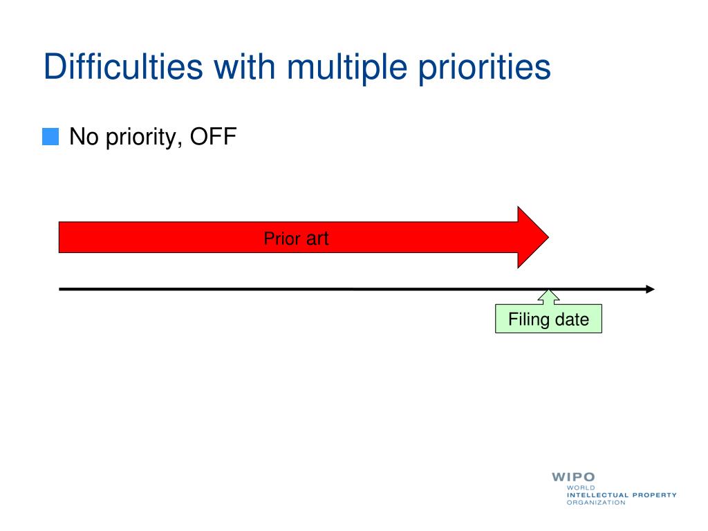 Difficulties with multiple priorities • No priority, OFF Prior art Filing date