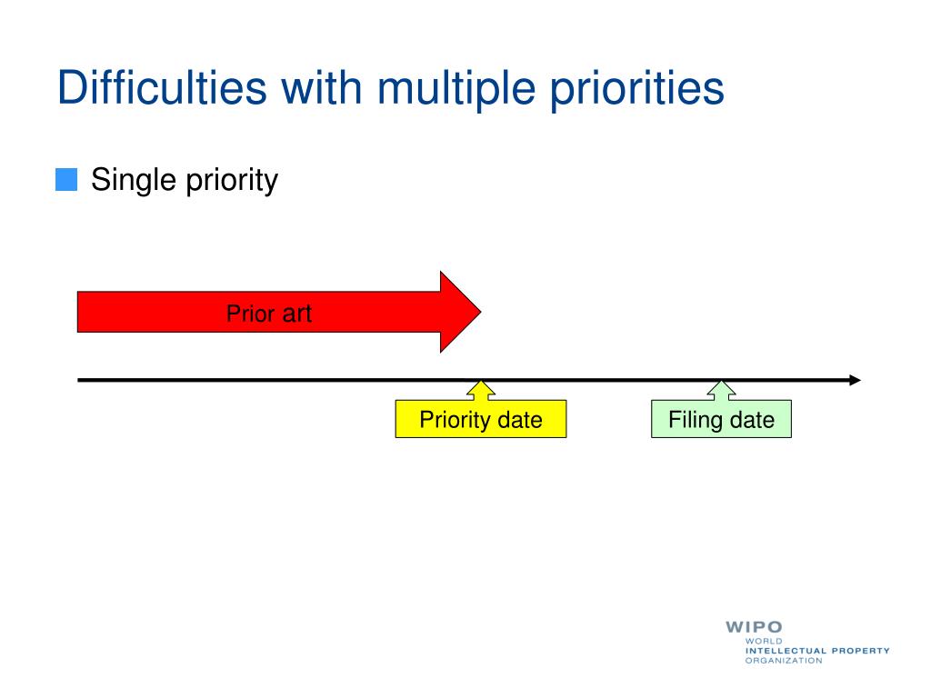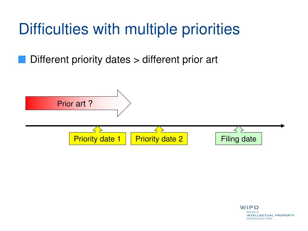 Difficulties with multiple priorities • Single priority Prior art Priority date Filing date