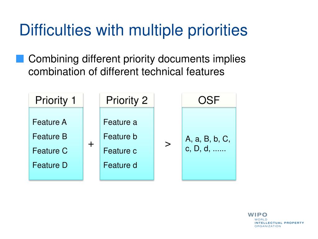 Difficulties with multiple priorities • Combining different priority documents implies combination of different technical features Priority 1 Priority 2 OSF + > Feature A Feature B Feature C Feature D Feature a Feature b Feature c Feature d A, a, B, b, C, c, D, d, ......