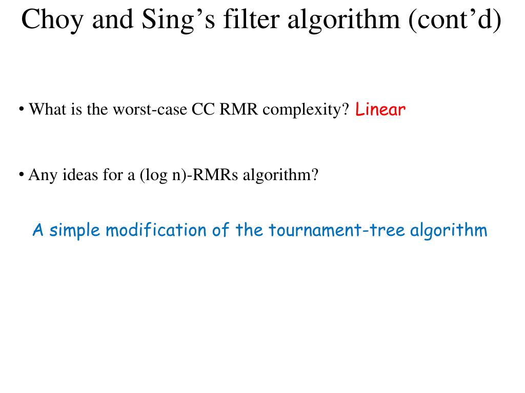 Choy and Sing’s filter algorithm (cont’d) • What is the CC RMR complexity? Program for process i • For (curr=0; cur < log n +1; curr++) • A[curr].turn := p • Await A[curr].b • A[curr].b:=true • if (A[curr]. turn ≠ i) • A[curr].c := true // mark that some process failed on filter • A[curr].b := false • return not-elected • else if (curr > 0) A[curr-1].c • return elected // Other processes will never reach this filter • Else • curr := curr+1 • EndFor