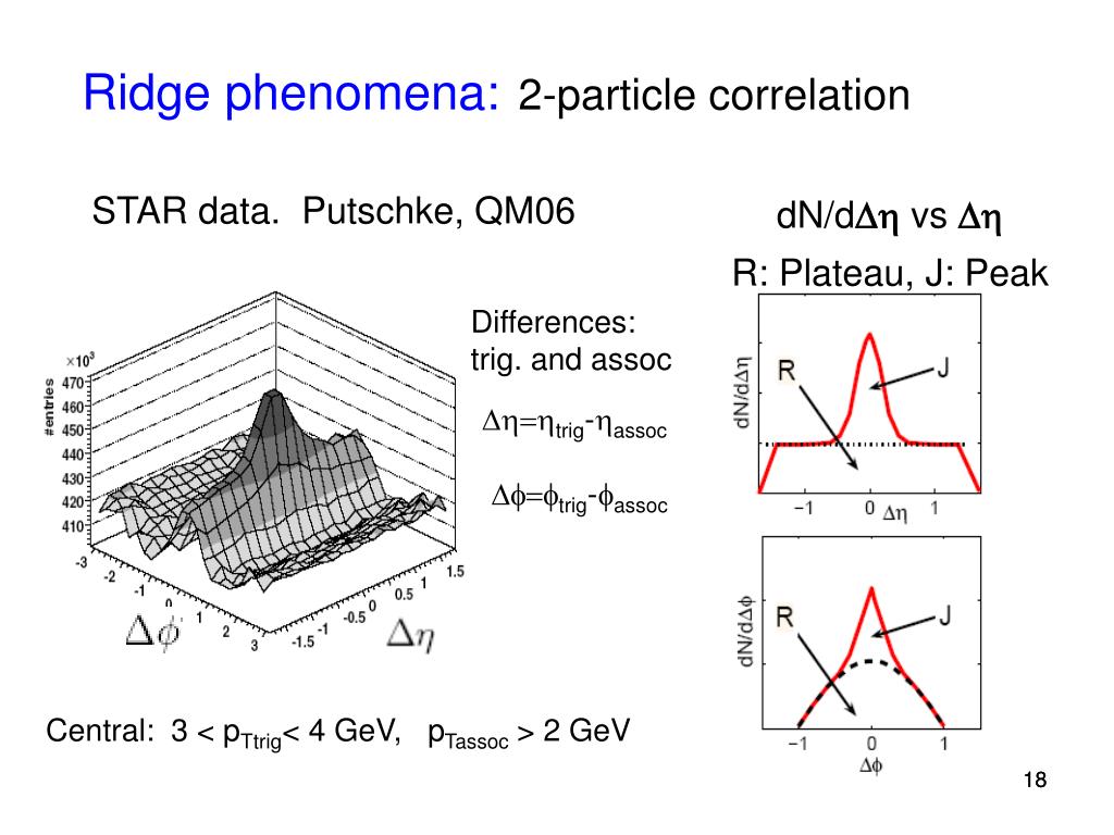 Ridge phenomena:2-particle correlation STARdata. Putschke, QM06 dN/dDh vs Dh R: Plateau, J: Peak Differences: trig. and assoc Dh=htrig-hassoc Df=ftrig-fassoc Central: 3 < pTtrig< 4 GeV, pTassoc > 2 GeV 18