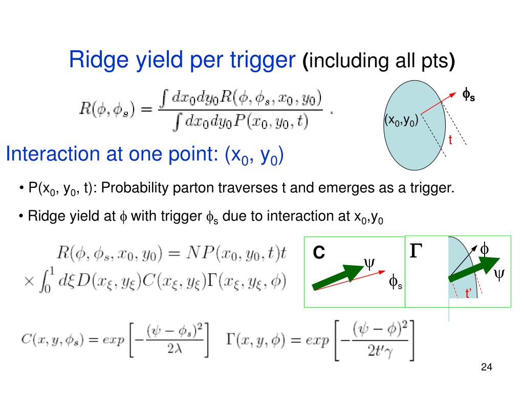 Ridge yield at f with trigger fs due to interaction at x0,y0 Ridge yield per trigger(including all pts) fs (x0,y0) t Interaction at one point:(x0, y0) • P(x0, y0, t): Probability parton traverses t and emerges as a trigger. t’ f G C y y fs t’