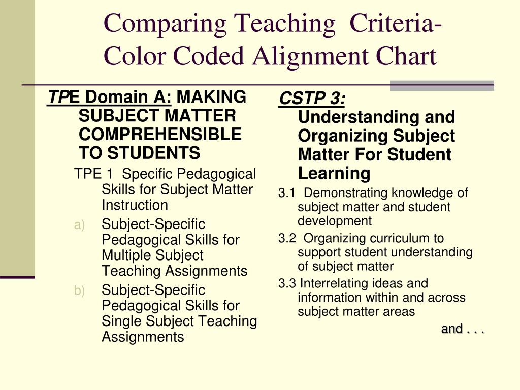 Comparing Teaching Criteria-Color Coded Alignment Chart TPE Domain A: MAKING SUBJECT MATTER COMPREHENSIBLE TO STUDENTS TPE 1 Specific Pedagogical Skills for Subject Matter Instruction Subject-Specific Pedagogical Skills for Multiple Subject Teaching Assignments Subject-Specific Pedagogical Skills for Single Subject Teaching Assignments CSTP 3: Understanding and Organizing Subject Matter For Student Learning 3.1 Demonstrating knowledge of subject matter and student development 3.2 Organizing curriculum to support student understanding of subject matter 3.3 Interrelating ideas and information within and across subject matter areas and . . .