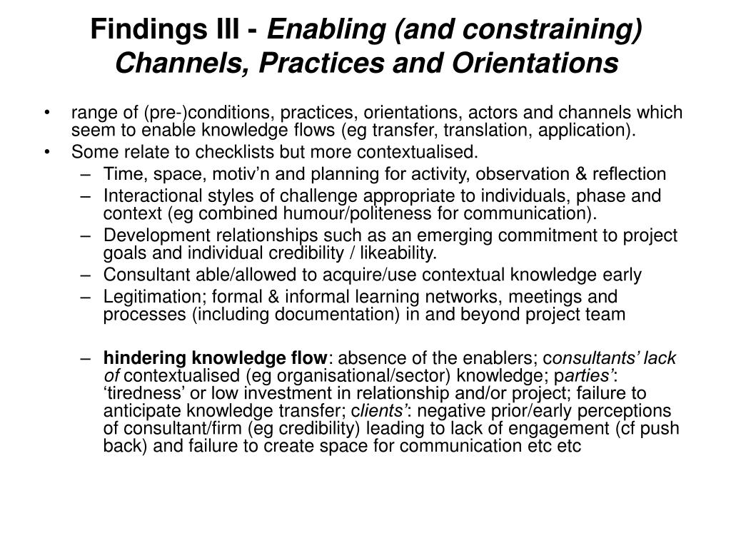 Findings III - Enabling (and constraining) Channels, Practices and Orientations • range of (pre-)conditions, practices, orientations, actors and channels which seem to enable knowledge flows (eg transfer, translation, application). • Some relate to checklists but more contextualised. • Time, space, motiv’n and planning for activity, observation & reflection • Interactional styles of challenge appropriate to individuals, phase and context (eg combined humour/politeness for communication). • Development relationships such as an emerging commitment to project goals and individual credibility / likeability. • Consultant able/allowed to acquire/use contextual knowledge early • Legitimation; formal & informal learning networks, meetings and processes (including documentation) in and beyond project team • hindering knowledge flow: absence of the enablers; consultants’ lack of contextualised (eg organisational/sector) knowledge; parties’: ‘tiredness’ or low investment in relationship and/or project; failure to anticipate knowledge transfer; clients’: negative prior/early perceptions of consultant/firm (eg credibility) leading to lack of engagement (cf push back) and failure to create space for communication etc etc