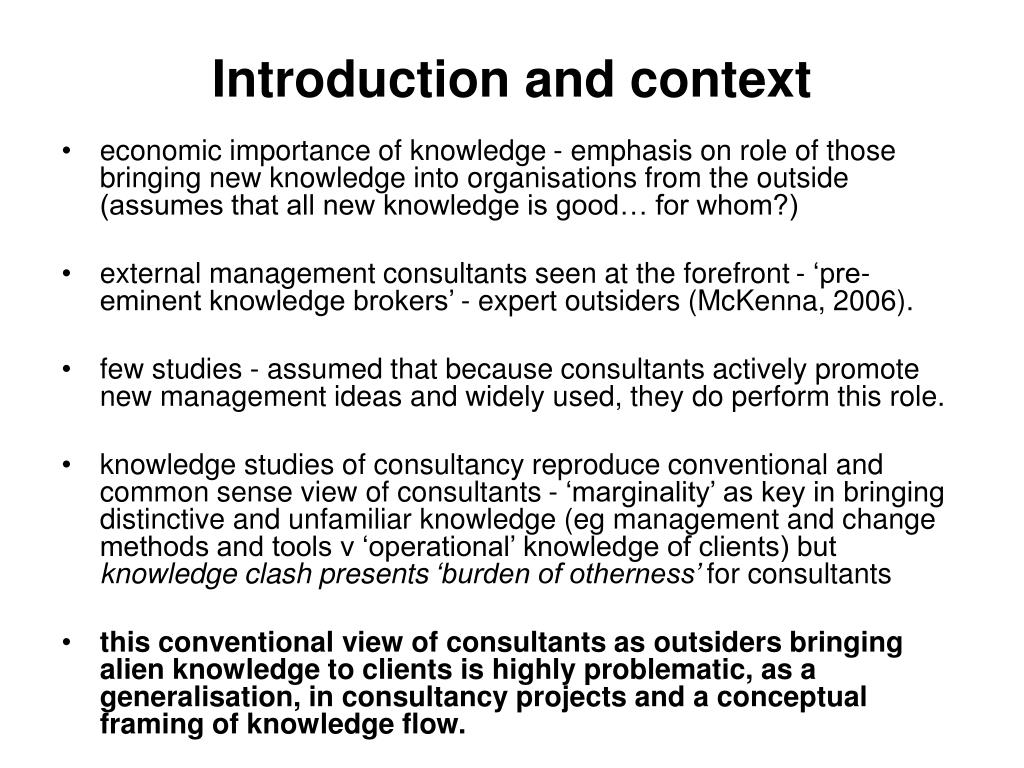 Introduction and context • economic importance of knowledge - emphasis on role of those bringing new knowledge into organisations from the outside (assumes that all new knowledge is good… for whom?) • external management consultants seen at the forefront - ‘pre-eminent knowledge brokers’ - expert outsiders (McKenna, 2006). • few studies - assumed that because consultants actively promote new management ideas and widely used, they do perform this role. • knowledge studies of consultancy reproduce conventional and common sense view of consultants - ‘marginality’ as key in bringing distinctive and unfamiliar knowledge (eg management and change methods and tools v ‘operational’ knowledge of clients) but knowledge clash presents‘burden of otherness’ for consultants • this conventional view of consultants as outsiders bringing alien knowledge to clients is highly problematic, as a generalisation, in consultancy projects and a conceptual framing of knowledge flow.