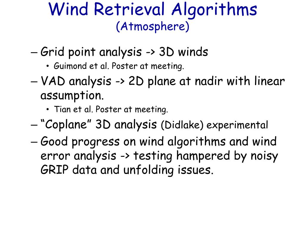 Wind Retrieval Algorithms(Atmosphere) • Grid point analysis -> 3D winds • Guimond et al. Poster at meeting. • VAD analysis -> 2D plane at nadir with linear assumption. • Tian et al. Poster at meeting. • “Coplane” 3D analysis (Didlake) experimental • Good progress on wind algorithms and wind error analysis -> testing hampered by noisy GRIP data and unfolding issues.