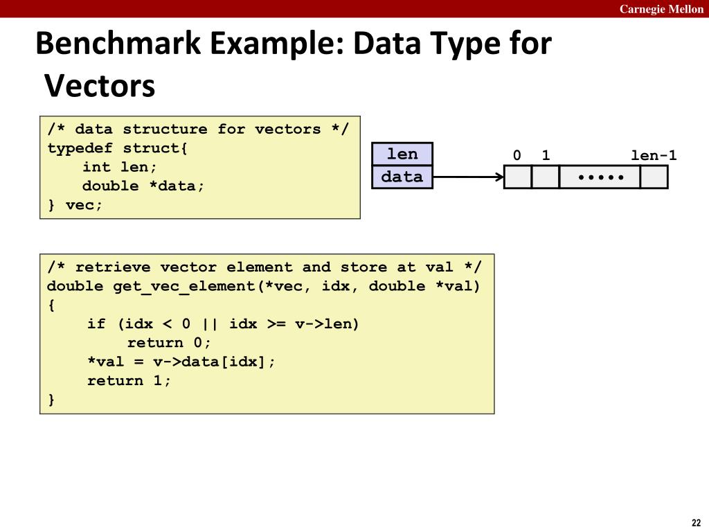 Benchmark Example: Data Type for Vectors /* data structure for vectors */ typedefstruct{ intlen; double *data; } vec; 1 len-1 0 len data /* retrieve vector element and store at val */ double get_vec_element(*vec, idx, double *val) { if (idx < 0 || idx >= v->len) return 0; *val = v->data[idx]; return 1; }