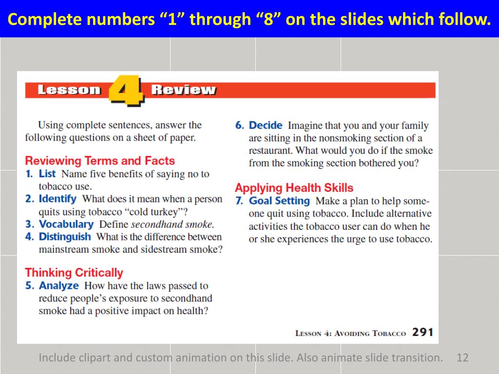 1. Health (Teen Health 2) Chapter 10 Lesson 4Avoiding Tobacco, pp. 287-297 Change to your Full NameFirst save in the ‘My Documents’. When finished, submit by saving in the ‘My Documents and closingthe file—leave the name the same. An answer is only half (½) correct without the page number. Note you may copy the questions and write the answers on a sheet of paper rather than complete this online version of the assignment if you prefer. Right click & Open for a presentation on this lesson. Include clipart and custom animation on this slide. Also animate slide transition.