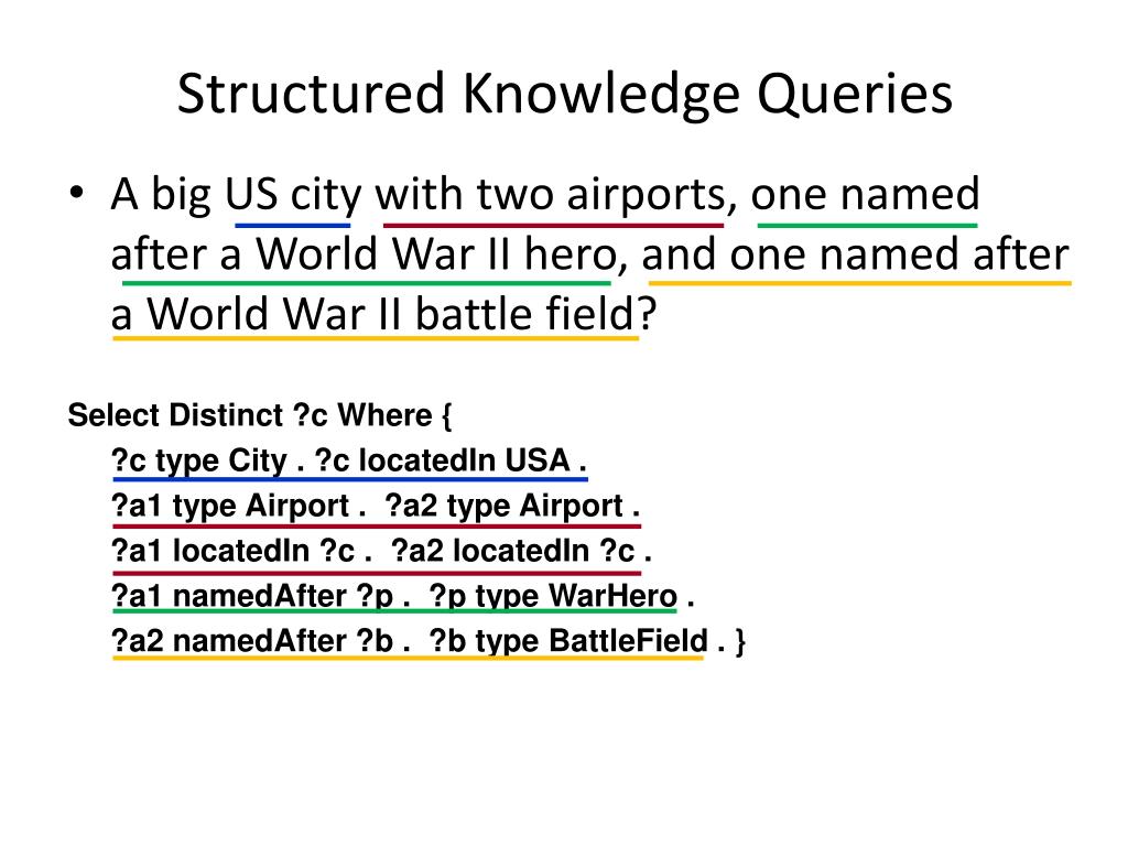 Structured Knowledge Queries • A big US city with two airports, one named after a World War II hero, and one named after a World War II battle field? Select Distinct ?c Where { ?c type City . ?c locatedIn USA . ?a1 type Airport . ?a2 type Airport . ?a1 locatedIn ?c . ?a2 locatedIn ?c . ?a1 namedAfter ?p . ?p type WarHero . ?a2 namedAfter ?b . ?b type BattleField . }