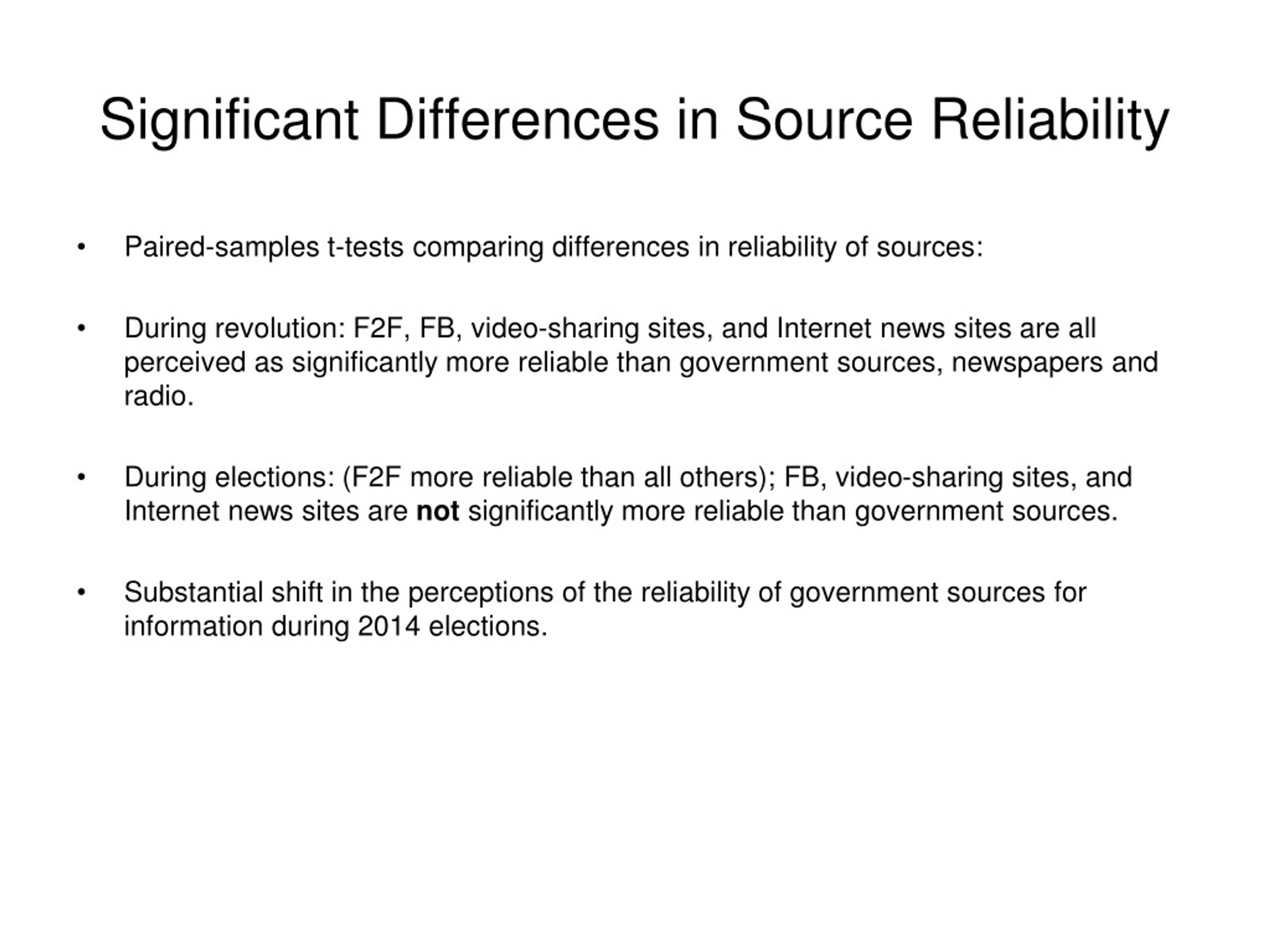 Significant Differences in Source Reliability • Paired-samples t-tests comparing differences in reliability of sources: • During revolution: F2F, FB, video-sharing sites, and Internet news sites are all perceived as significantly more reliable than government sources, newspapers and radio. • During elections: (F2F more reliable than all others); FB, video-sharing sites, and Internet news sites are not significantly more reliable than government sources. • Substantial shift in the perceptions of the reliability of government sources for information during 2014 elections.