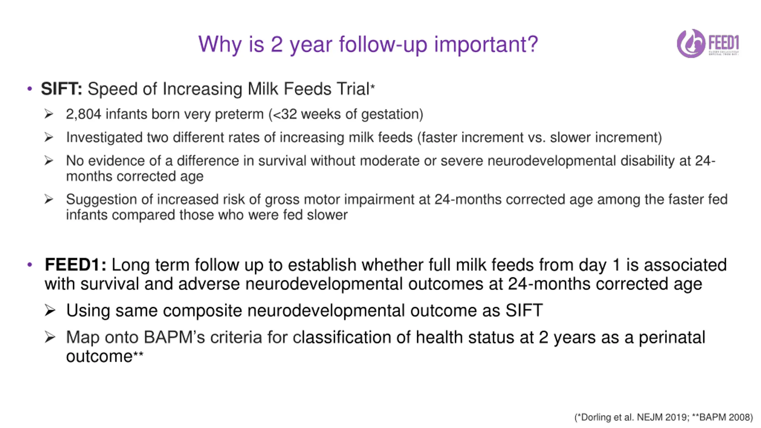 3. Why is 2 year follow-up important? • SIFT: Speed of Increasing Milk Feeds Trial*  2,804 infants born very preterm (<32 weeks of gestation)  Investigated two different rates of increasing milk feeds (faster increment vs. slower increment)  No evidence of a difference in survival without moderate or severe neurodevelopmental disability at 24- months corrected age  Suggestion of increased risk of gross motor impairment at 24-months corrected age among the faster fed infants compared those who were fed slower • FEED1: Long term follow up to establish whether full milk feeds from day 1 is associated with survival and adverse neurodevelopmental outcomes at 24-months corrected age  Using same composite neurodevelopmental outcome as SIFT  Map onto BAPM’s criteria for classification of health status at 2 years as a perinatal outcome** (*Dorling et al. NEJM 2019; **BAPM 2008)