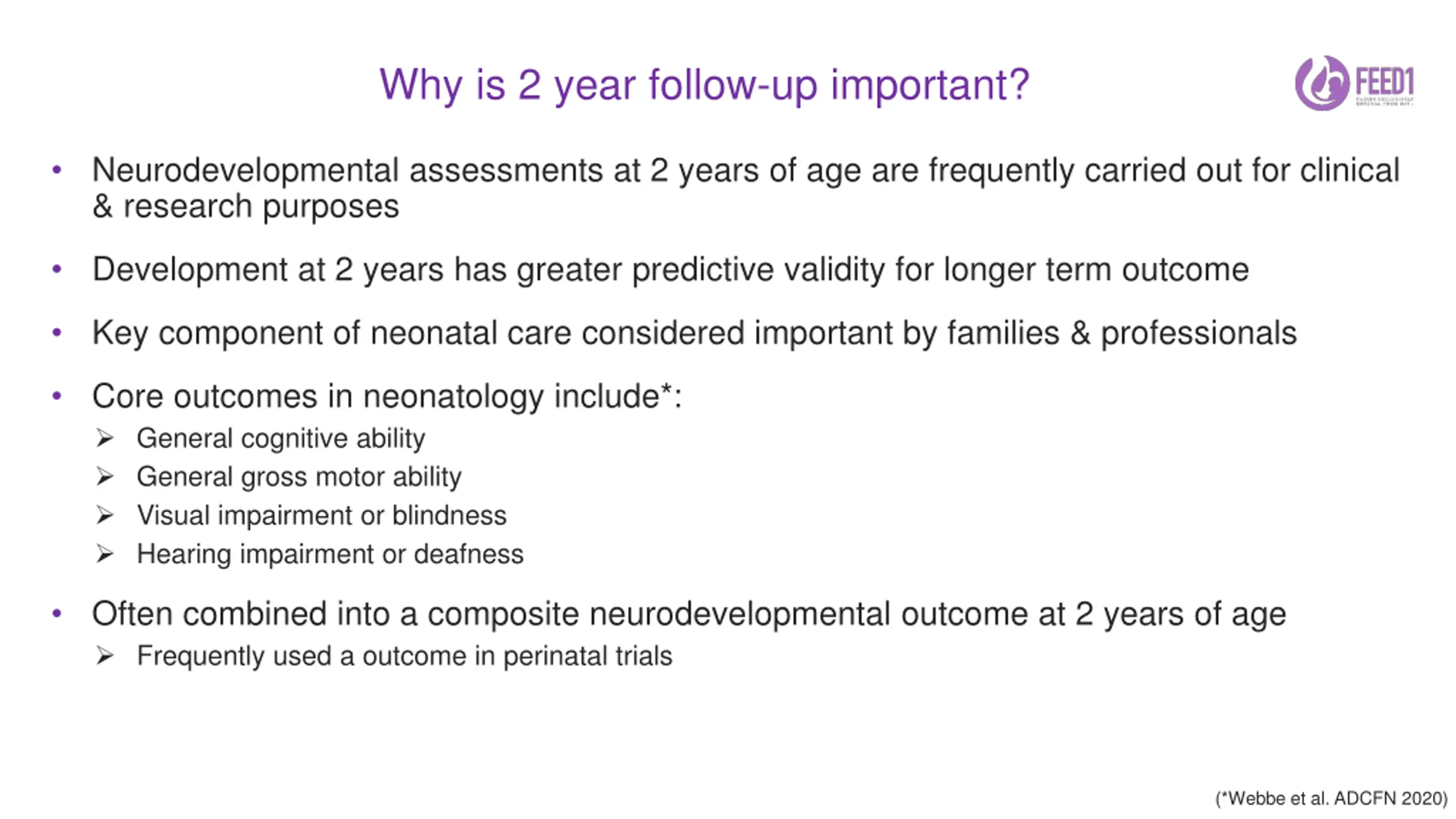 2. Why is 2 year follow-up important? • Neurodevelopmental assessments at 2 years of age are frequently carried out for clinical & research purposes • Development at 2 years has greater predictive validity for longer term outcome • Key component of neonatal care considered important by families & professionals • Core outcomes in neonatology include*:  General cognitive ability  General gross motor ability  Visual impairment or blindness  Hearing impairment or deafness • Often combined into a composite neurodevelopmental outcome at 2 years of age  Frequently used a outcome in perinatal trials (*Webbe et al. ADCFN 2020)