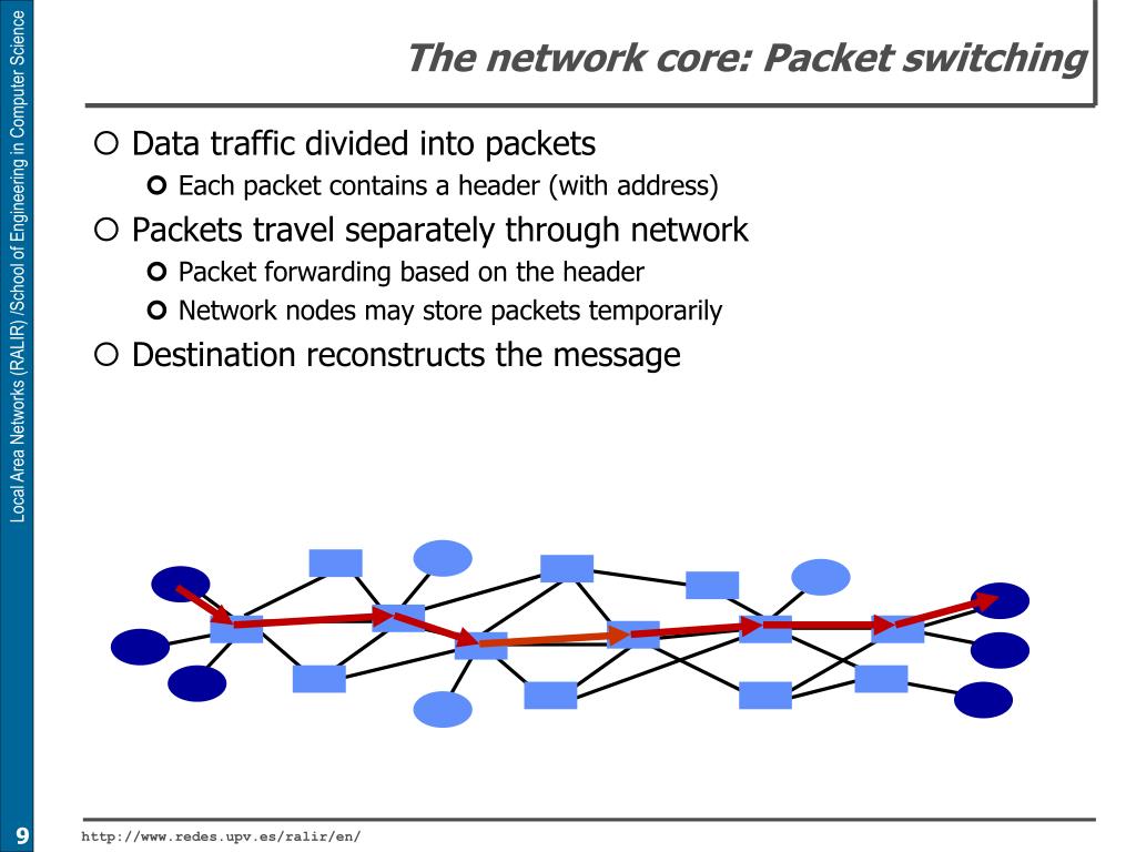 The network core: Packet switching • Data traffic divided into packets • Each packet contains a header (with address) • Packets travel separately through network • Packet forwarding based on the header • Network nodes may store packets temporarily • Destination reconstructs the message
