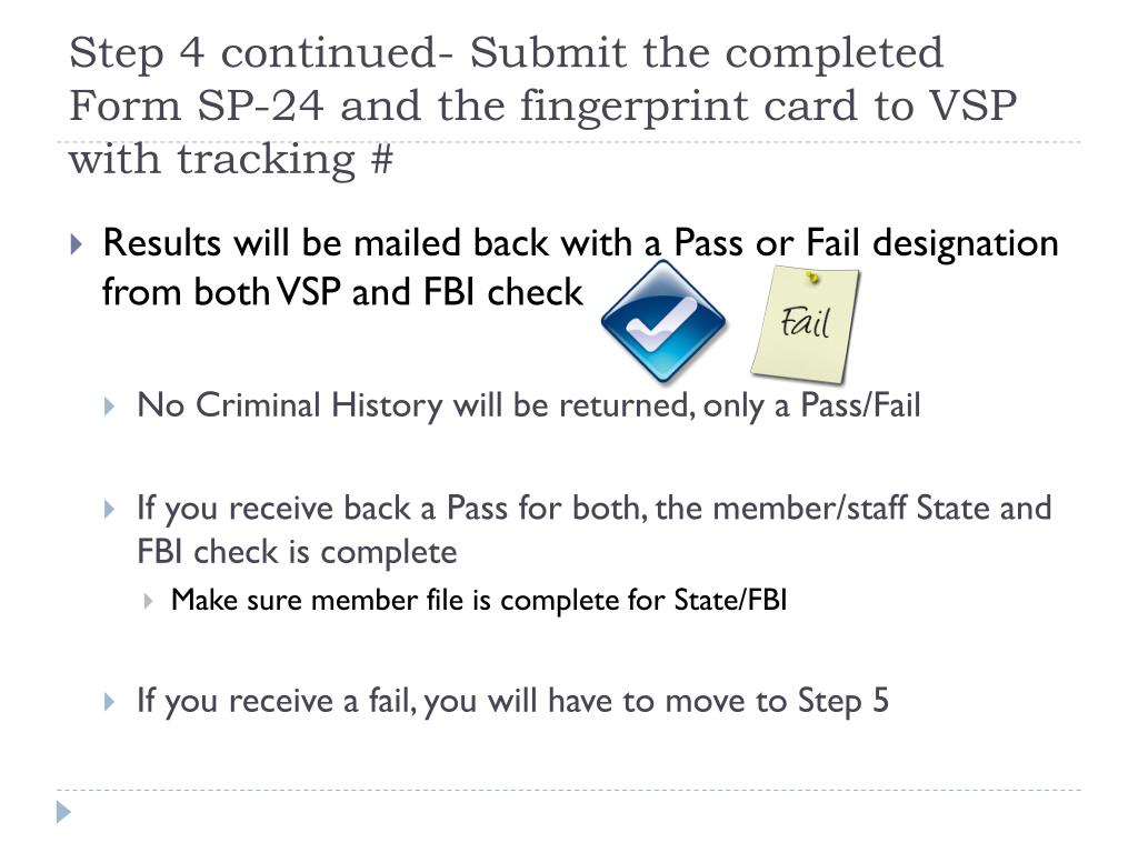 Step 4 continued- Submit the completed Form SP-24 and the fingerprint card to VSP with tracking # • Results will be mailed back with a Pass or Fail designation from both VSP and FBI check • No Criminal History will be returned, only a Pass/Fail • If you receive back a Pass for both, the member/staff State and FBI check is complete • Make sure member file is complete for State/FBI • If you receive a fail, you will have to move to Step 5