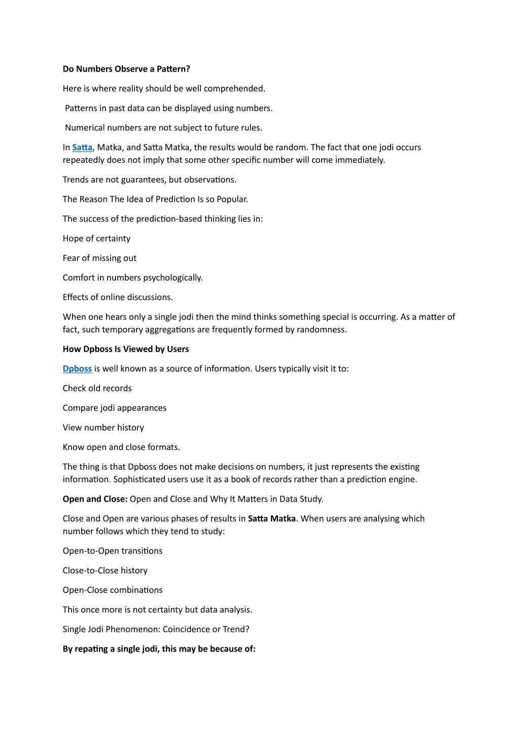 Do Numbers Observe a Pattern? Here is where reality should be well comprehended. Patterns in past data can be displayed using numbers. Numerical numbers are not subject to future rules. In Satta, Matka, and Satta Matka, the results would be random. The fact that one jodi occurs repeatedly does not imply that some other specific number will come immediately. Trends are not guarantees, but observations. The Reason The Idea of Prediction Is so Popular. The success of the prediction-based thinking lies in: Hope of certainty Fear of missing out Comfort in numbers psychologically. Effects of online discussions. When one hears only a single jodi then the mind thinks something special is occurring. As a matter of fact, such temporary aggregations are frequently formed by randomness. How Dpboss Is Viewed by Users Dpboss is well known as a source of information. Users typically visit it to: Check old records Compare jodi appearances View number history Know open and close formats. The thing is that Dpboss does not make decisions on numbers, it just represents the existing information. Sophisticated users use it as a book of records rather than a prediction engine. Open and Close: Open and Close and Why It Matters in Data Study. Close and Open are various phases of results in Satta Matka. When users are analysing which number follows which they tend to study: Open-to-Open transitions Close-to-Close history Open-Close combinations This once more is not certainty but data analysis. Single Jodi Phenomenon: Coincidence or Trend? By repating a single jodi, this may be because of: