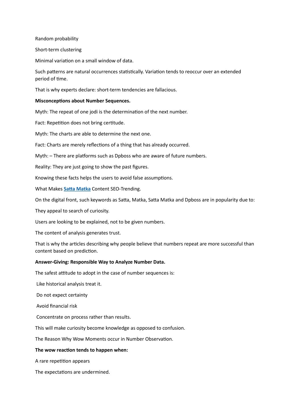 Random probability Short-term clustering Minimal variation on a small window of data. Such patterns are natural occurrences statistically. Variation tends to reoccur over an extended period of time. That is why experts declare: short-term tendencies are fallacious. Misconceptions about Number Sequences. Myth: The repeat of one jodi is the determination of the next number. Fact: Repetition does not bring certitude. Myth: The charts are able to determine the next one. Fact: Charts are merely reflections of a thing that has already occurred. Myth: – There are platforms such as Dpboss who are aware of future numbers. Reality: They are just going to show the past figures. Knowing these facts helps the users to avoid false assumptions. What Makes Satta Matka Content SEO-Trending. On the digital front, such keywords as Satta, Matka, Satta Matka and Dpboss are in popularity due to: They appeal to search of curiosity. Users are looking to be explained, not to be given numbers. The content of analysis generates trust. That is why the articles describing why people believe that numbers repeat are more successful than content based on prediction. Answer-Giving: Responsible Way to Analyze Number Data. The safest attitude to adopt in the case of number sequences is: Like historical analysis treat it. Do not expect certainty Avoid financial risk Concentrate on process rather than results. This will make curiosity become knowledge as opposed to confusion. The Reason Why Wow Moments occur in Number Observation. The wow reaction tends to happen when: A rare repetition appears The expectations are undermined.