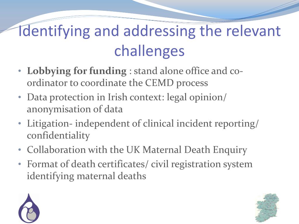 Identifying and addressing the relevant challenges • Lobbying for funding : stand alone office and co-ordinator to coordinate the CEMD process • Data protection in Irish context: legal opinion/ anonymisationof data • Litigation- independent of clinical incident reporting/ confidentiality • Collaboration with the UK Maternal Death Enquiry • Format of death certificates/ civil registration system identifying maternal deaths