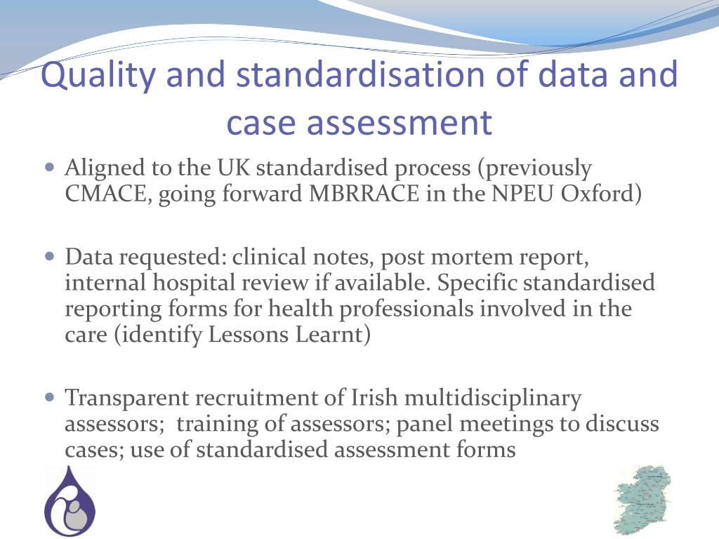 Quality and standardisation of data and case assessment • Aligned to the UK standardised process (previously CMACE, going forward MBRRACE in the NPEU Oxford) • Data requested: clinical notes, post mortem report, internal hospital review if available. Specific standardised reporting forms for health professionals involved in the care (identify Lessons Learnt) • Transparent recruitment of Irish multidisciplinary assessors; training of assessors; panel meetings to discuss cases; use of standardised assessment forms