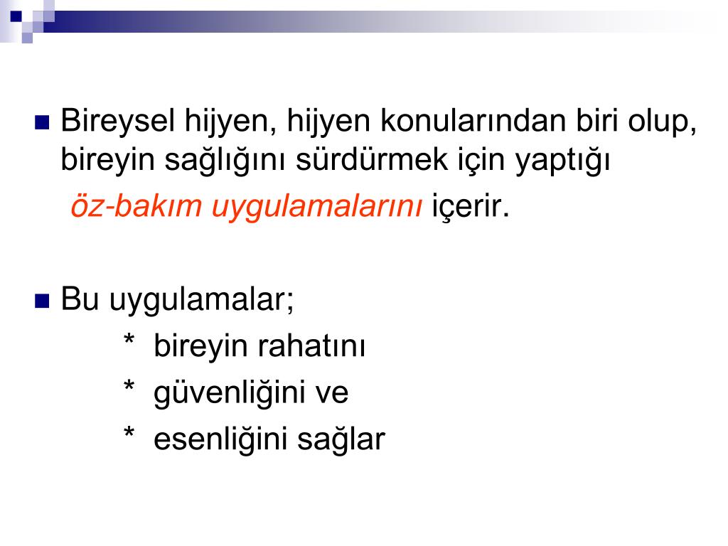 Kişisel hijyen, - bireyin rahatlık, - güvenlik ve - iyilik durumunu etkiler. • Sağlıklı bireyler kendi bireysel hijyen gereksinimlerini karşılayabilirler. • Hasta ya da sınırlılığı olan bireyler ise çeşitli düzeyde yardıma gereksinim duyabilirler.