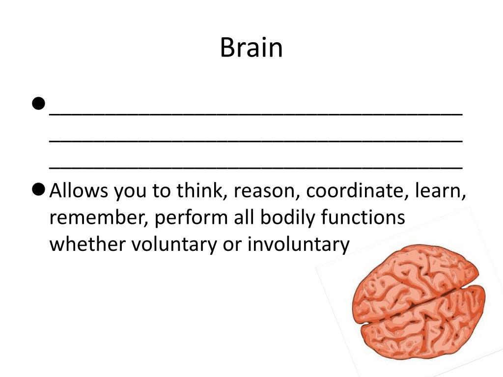 Brain • _______________________________________________________________________________________________________________ • Allows you to think, reason, coordinate, learn, remember, perform all bodily functions whether voluntary or involuntary