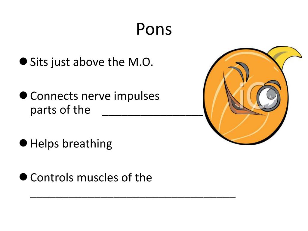 Pons • Sits just above the M.O. • Connects nerve impulses to other parts of the ______________________ • Helps breathing • Controls muscles of the ________________________________
